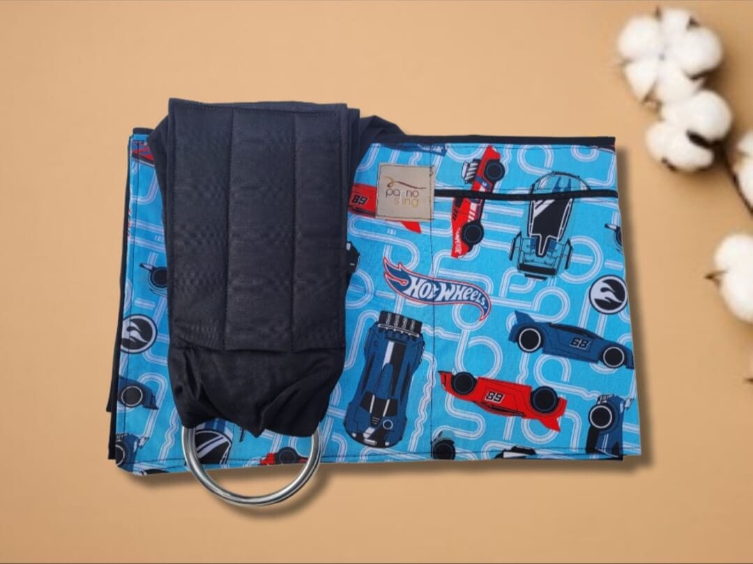 O Sling de Argolas Hot Wheels é uma faixa de tecido que se prende em duas argolas. Após a colocação, fica parecido com uma rede amarrada ao corpo do adulto. Seguindo as orientações de segurança, nosso produto é feito com argolas de alumínio importadas e sem emendas. Elas são submetidas a testes de impacto, tração, lavagem e variação de temperatura. As argolas são presas com costura reforçada e almofadada para conferir um apoio confortável para o ombro do adulto. O Panno Sling de Argola conta ainda com um detalhe estampado com bolso fechado a zíper onde você pode carregar alguns itens pessoais para uma saída rápida com seu bebê. Pode ser usado desde o nascimento até o bebê chegar aos 15 kgs (cerca de 3 anos).